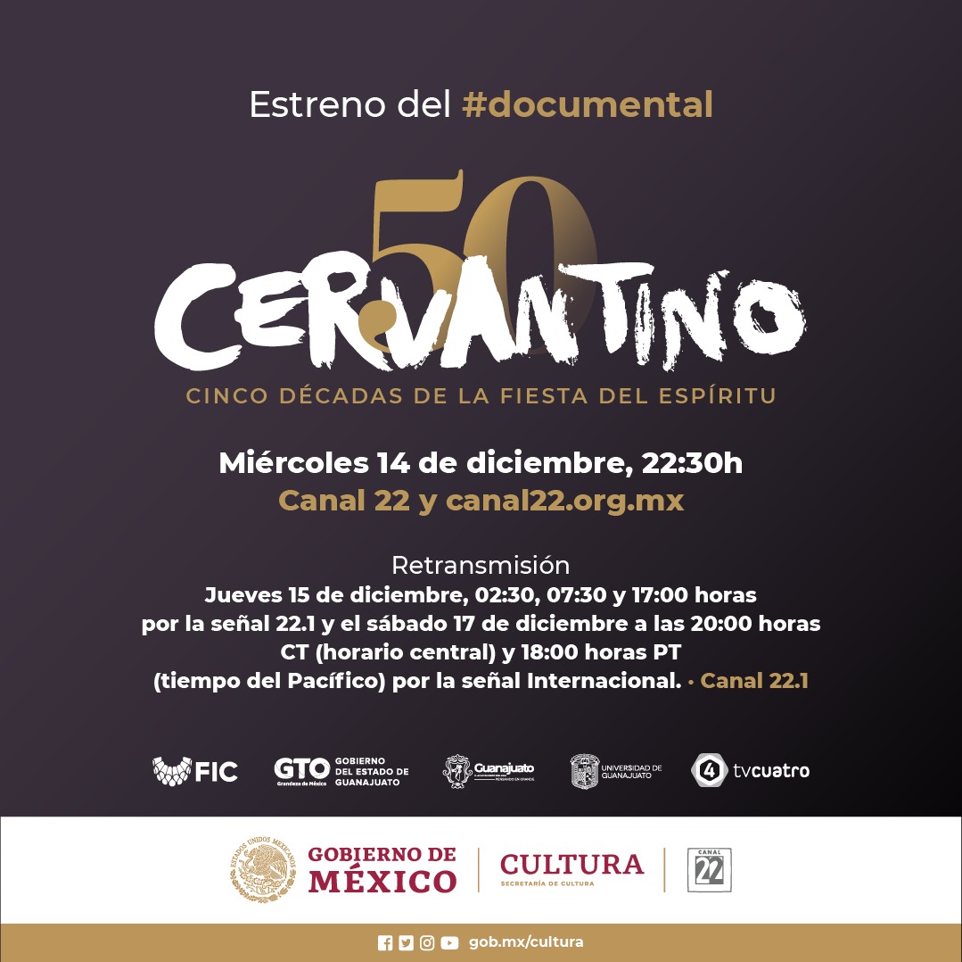 La Secretaría de Cultura del Gobierno de México, en el marco del 50 aniversario del Festival Internacional Cervantino (FIC), realizado el pasado mes de octubre, y a través de Canal 22, estrena el documental Cervantino 50: cinco décadas de la fiesta del espíritu, una coproducción con la televisora cultural TV4 de Guanajuato y Sopa de Pato Producciones, en la que se hace un recorrido a lo largo de medio siglo de presentaciones artísticas del festival.